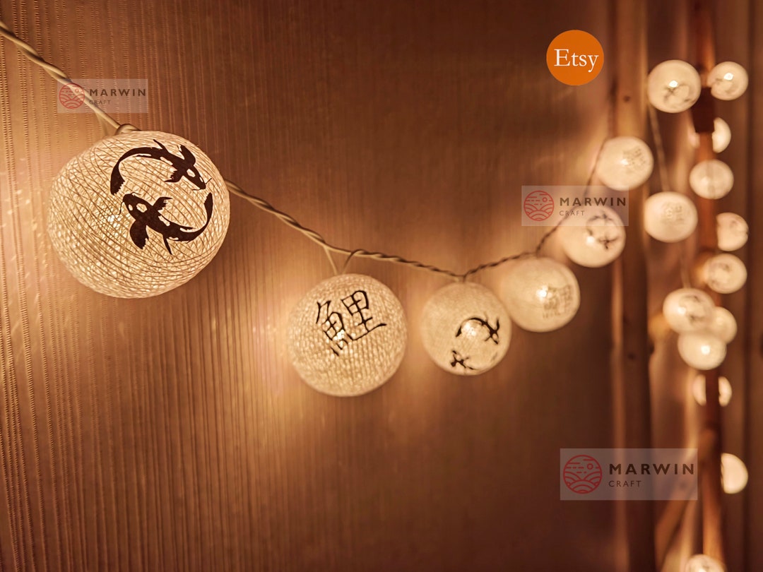 20 String Lights Lucky Koi Fish Japanese Kanji Lantern Cotton